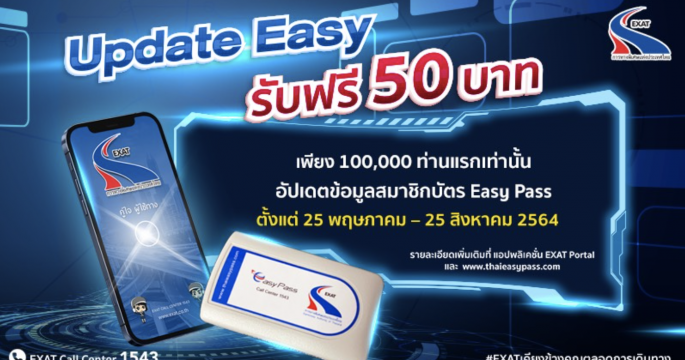 การทางพิเศษแห่งประเทศไทย (กทพ.) กระทรวงคมนาคม จัดกิจกรรม “Update Easy รับฟรี 50 บาท” วันที่ 25 พฤษภาคม – 25 สิงหาคม 2564 เชิญชวนสมาชิกบัตร Easy Pass อัปเดตข้อมูลสมาชิก ให้เป็นปัจจุบัน โดย 100,000 ท่านแรกที่อัปเดตข้อมูล รับฟรี 50 บาท