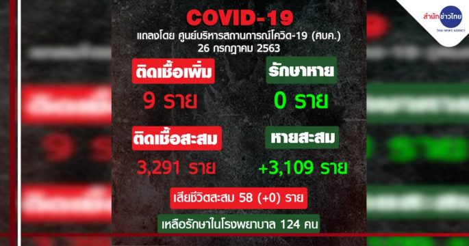 สถานการณ์ โรคติดเชื้อไวรัสโคโรนา 2019 (COVID-19) ในประเทศไทย ประจำวันที่ 26 ก.ค. 63 ผู้ป่วยรายใหม่ 9 ราย มาจากต่างประเทศและพักใน State Quarantine