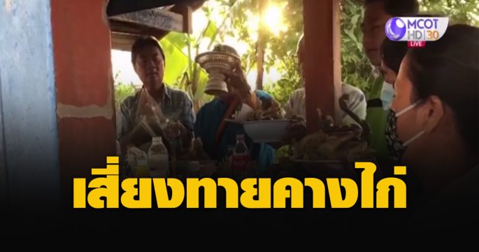 นายทองคำ ศาลางาม เล่าว่า ช่วงก่อนฤดูทำนา ขึ้น 6 ค่ำ เดือน 6 ของทุกปี ชาวบ้านจะต้องนำไก่ที่ต้มแล้ว ไปเซ่นไหว้ที่ศาลปู่ตา เพื่อเสี่ยงทายคางไก่ดู ว่าในปีนี้น้ำท่าอุดมสมบูรณ์ดีมั้ย ฝนจะแล้ง หรือน้ำจะท่วม ก็จะดูที่คางไก่ ถ้าคางไก่ผอมสูงอวบ ทายว่าน้ำจะเยอะ ต้นข้าวจะยืดตามน้ำ แต่ก็ได้เก็บเกี่ยวอยู่ คางไก่บางคนก็เล็กเรียวสั้น ทายว่าฝนแล้ง น้ำท่าไม่ถึงเพราะที่นาอยู่ตรงเนินสูง แต่ปีนี้โดยรวมแล้ว สรุปจากคางไก่หลายๆคนสวยงามมาก น้ำท่าบริบูรณ์ดี