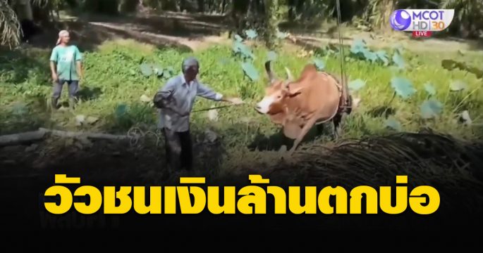 “แดง ไบเล่” วัวชนเงินล้าน พลัดตกบ่อร้างจมโคลน กู้ภัยพยายามช่วย ก่อนตัดสินใจนำรถเครนมายก จนช่วยชีวิตไว้ได้ในสภาพอิดโรย