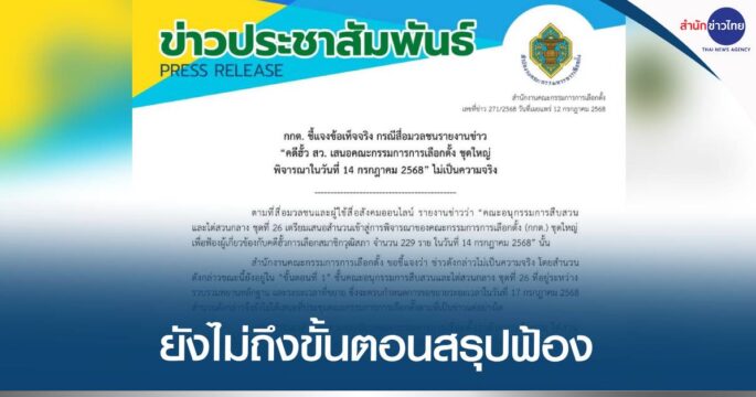 สำนักงาน กกต. 12 ก.ค. – กกต.แจงยังไม่ถึงขั้นตอนสรุปฟ้อง สว.ฮั้ว ยังอยู่ในขั้นที่ 1 แถมอนุฯ 26 ขอขยายเวลาพิจารณาถึง 17 ก.ค. อย่าสร้างกระแส มีอีก 4 ขั้นตอน เลิกปล่อยข่าวลือ อีกนานกว่าจะถึงมือ กกต.ชุดใหญ่ วันนี้ (12 ก.ค.) กกต.ออกเอกสารชี้แจง หลังมีข่าวคณะอนุกรรมการสืบสวนและไต่สวนกลาง ชุดที่ 26 เตรียมเสนอสำนวนเข้าสู่การพิจารณาของคณะกรรมการการเลือกตั้งชุดใหญ่ เพื่อฟ้องผู้เกี่ยวข้องกับคดีฮั้วการเลือกสมาชิกวุฒิสภา จำนวน 229 ราย ในวันจันทร์ที่ 14 กรกฎาคมนี้ ข่าวดังกล่าวไม่เป็นความจริง โดยสำนวนดังกล่าวขณะนี้ยังอยู่ในขั้นตอนที่ 1 ชั้นคณะอนุกรรมการสืบสวนและไต่สวนกลาง ชุดที่ 26 ที่อยู่ระหว่างรวบรวมพยานหลักฐาน และระยะเวลาที่ขยาย ซึ่งจะครบกำหนดการขอขยายระยะเวลาในวันที่ 17 กรกฎาคม 2568 สำนวนดังกล่าวจึงยังไม่ได้เสนอที่ประชุมคณะกรรมการการเลือกตั้งตามที่เป็นข่าวแต่อย่างใด การพิจารณาสำนวนตามระเบียบ กกต.ว่าด้วยการสืบสวน ไต่สวน และวินิจฉัยชี้ขาด พ.ศ. 2561 […]