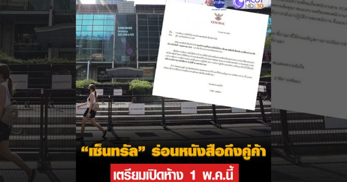 “เซ็นทรัล” ร่อนหนังสือถึงคู่ค้า เตรียมเปิดห้าง 1 พ.ค.นี้ เวลาเปิด-ปิด สาขาตามปกติของแต่ละสาขา ทั้งนี้ขอให้พนักงานเข้ารายงานตัวที่สาขา ในวันที่ 28 เม.ย.63