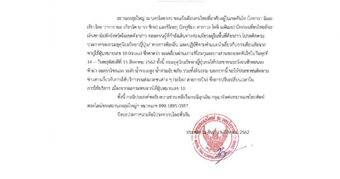 สถานกงสุลใหญ่ ณ นครโอซากา ขอแจ้งเตือนคนไทยที่อาศัยอยู่ในเขตคันไซ รับมือพายุไต้ฝุ่นหมายเลข 10 (Krosa) คาดว่าจะเคลื่อนผ่านเกาะชิโกะกุและบางส่วนของเขตคันไซในวันที่ 14-15 ส.ค.62
