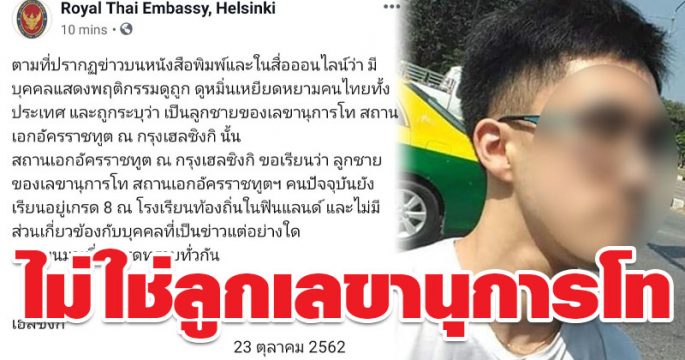 สถานเอกอัครราชทูต ณ กรุงเฮลซิงกิ แถลงกรณีหนุ่มแว่นหัวร้อนจบนอก ไม่ใช่ลูกชายของเลขานุการโท