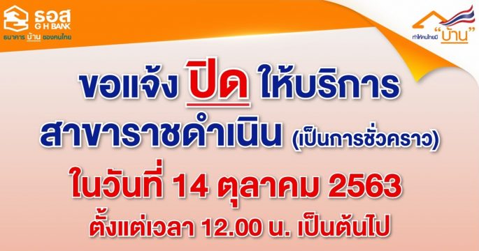ธอส.ปิดให้บริการสาขาบิ๊กซี ราชดำริ ชั่วคราว วันที่ 15 ตุลาคม 2563 เวลา 13.00 น. เป็นต้นไป