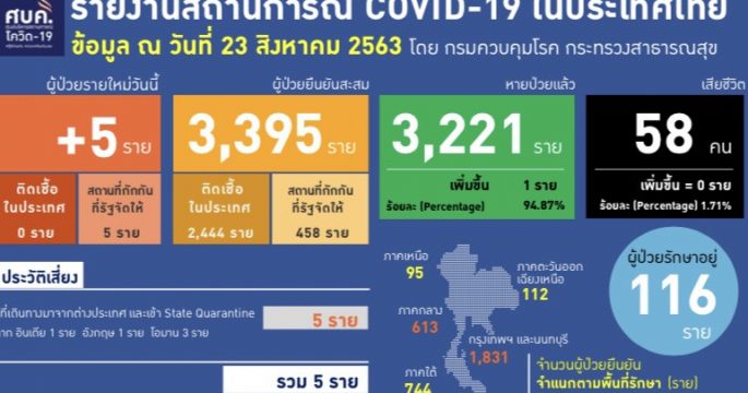 ข้อมูล ณ วันที่ 23 สิงหาคม 2563 โดย กรมควบคุมโรค กระทรวงสาธารณสุข ผู้ป่วยรายใหม่วันนี้ เพิ่มขึ้น 5ราย อยู่ในสถานที่กักกันที่รัฐจัดให้ มีผู้ป่วยยืนยันสะสม 3,395ราย หายป่วยแล้ว 3,221เสียชีวิต 58 คน