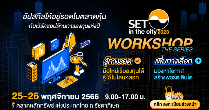 กรุงเทพฯ 20 พ.ย. – ตลท.จัดงาน SET in the City 2023 ชวนผู้ลงทุนอัปสกิลในเวิร์กชอปด้านการลงทุนแห่งปี 25-26 พ.ย. นี้ ตลาดหลักทรัพย์แห่งประเทศไทย ( ตลท.) ชวนอัปสกิลด้านการลงทุนกับ SET in the City 2023 “Workshop The Series” เวิร์กชอปการลงทุนแห่งปี ที่จะทำให้คุณรู้ทางเลือก พบโอกาสสร้างพอร์ตเติบโต งานเดียวรวมกูรูด้านการลงทุน ทั้งนักวิเคราะห์ นักลงทุน รวม 20 หัวข้อตลอด 2 วันเต็ม สอนอ่านงบ เจาะแผนธุกิจ เทคนิคสแกนหุ้น ปรับพอร์ตลงทุน อาทิ “Money Lecture: อัปสกิลเรื่องลงทุนที่คุณต้องรู้ กับลงทุนศาสตร์” โดย เบส กิตติศักดิ์ คงคา เจ้าของเพจลงทุนศาสตร์ แลกเปลี่ยนประสบการณ์เรื่องควรทำและห้ามทำในการลงทุน, “อย่าหาว่าน้าสอน ตอนพิเศษ.. อยากรวย […]