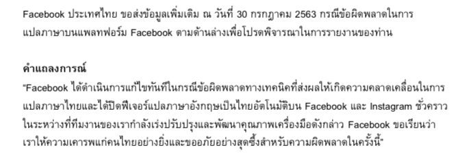 กรุงเทพฯ 30 ก.ค. เฟซบุ๊กออกแถลงการณ์กรณีข้อผิดพลาดในการแปลภาษายืนยันให้ความเคารพคนไทยอย่างยิ่งและขออภัยสุดซึ้ง เฟซบุ๊ก ประเทศไทย ออกคำแถลงการณ์ กรณีข้อผิดพลาดในการแปลภาษาบนแพลตฟอร์มดังนี้ Facebook ได้ดำเนินการแก้ไขทันทีในกรณีข้อผิดพลาดทางเทคนิคที่ส่งผลให้เกิดความคลาดเคลื่อนในการแปลภาษาไทยและได้ปิดฟีเจอร์แปลภาษาอังกฤษเป็นไทยอัตโนมัติบน Facebook และ Instagram ชั่วคราว ในระหว่างที่ทีมงานของเรากำลังเร่งปรับปรุงและพัฒนาคุณภาพเครื่องมือดังกล่าว Facebook ขอเรียนว่าเราให้ความเคารพแก่คนไทยอย่างยิ่งและขออภัยอย่างสุดซึ้งสำหรับความผิดพลาดในครั้งนี้-สำนักข่าวไทย.