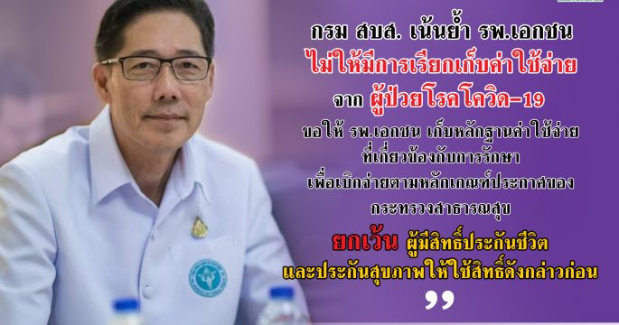 กรม สบส. ย้ำรพ.เอกชน ไม่เรียกเก็บค่าใช้จ่ายผู้ป่วยโควิด-19 ให้รักษาอย่างเต็มความสามารถ และจัดเก็บเอกสารหลักฐานค่าใช้จ่าย มาประกอบการเบิกจ่ายตามหลักเกณฑ์ที่กระทรวงสาธารณสุขประกาศ