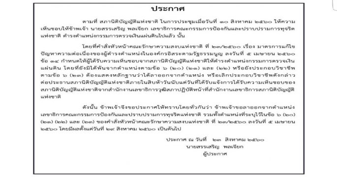 เลขาธิการ ป.ป.ช.แจ้งสื่อขอลาออกจากตำแหน่งมีผล 29 ส.ค.นี้ หลังสนช.เห็นชอบให้ดำรงตำแหน่งคตง.