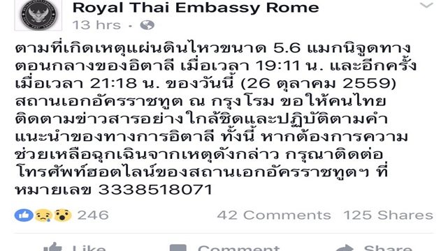 สถานทูตไทย ณ กรุงโรมให้คนไทยติดตามข่าวสารแผ่นดินไหวที่อิตาลีใกล้ชิด ปฏิบัติตามคำแนะนำของทางการ หากต้องการความช่วยเหลือติดต่อฮอตไลน์ 3338518071