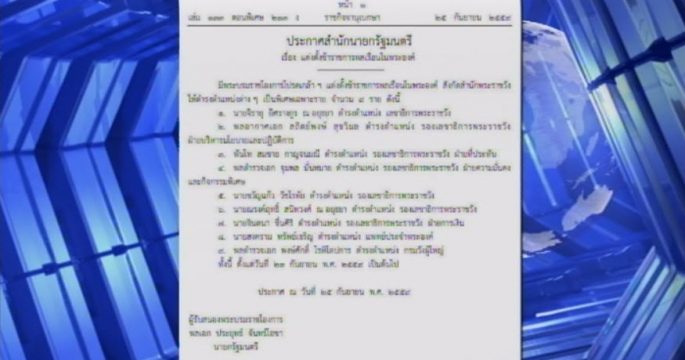 ราชกิจจานุเบกษาวันที่ 25 กันยายน 2559 เผยแพร่ประกาศสำนักนายกรัฐมนตรี เรื่องแต่งตั้งข้าราชการพลเรือนในพระองค์