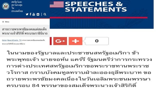 จอห์น แคร์รีส่งสารถวายพระพรสมเด็จพระนางเจ้าสิริกิติ์ พระบรมราชินีนาถ เนื่องในโอกาสวันเฉลิมพระชนมพรรษาครบรอบ 84 พรรษา