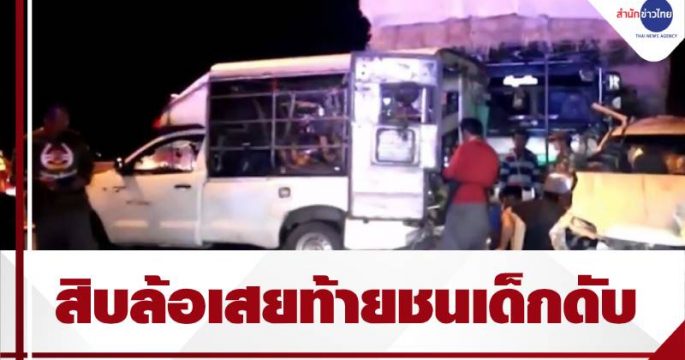 รถกระบะเสียกลางทาง จอดต่อท้าย 2 คันช่วยกันซ่อมริมถนนกาญจนาภิเษก ต.คลองสี่ อ.คลองหลวง จ.ปทุมธานี ถูกสิบล้อพุ่งชนท้ายอัดก๊อปปี้ ทำให้เด็กอายุ 14 นั่งรอท้ายคันแรก เสียชีวิต