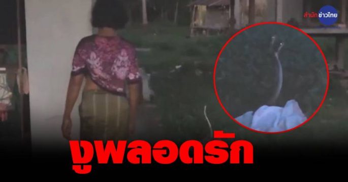 ชาวบ้านพบ “งูบองหนาบควาย” หรืองูสิงหางดำ ยาวกว่า 3 เมตร กำลังพลอดรักคลอเคลียชูคอม้วนร่างติดกันเป็นเกลียว เจ้าของบ้านนำเสื้อผ้าออกมาโยนให้ถูกตัวงู ตามความเชื่อ จะทำมาค้าขึ้น