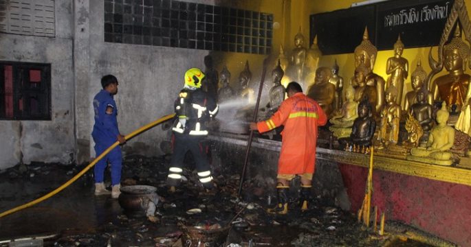 เจ้าหน้าที่เร่งฉีดน้ำสกัดไฟไหม้ศาลาการเปรียญวัดเขาลอยมูลโค เมืองราชบุรี ตั้งแต่เช้ามืด คาดไฟลัดวงจร