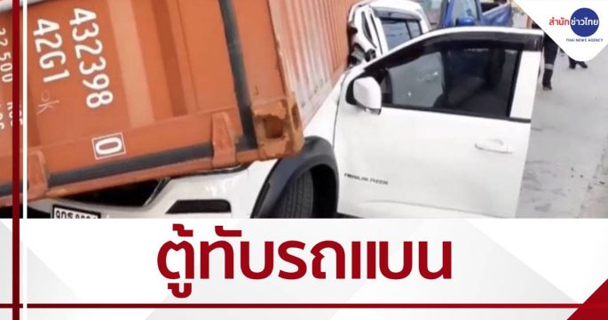 หน่วยกู้ภัยกำลังช่วยเหลือคนขับรถยนต์ ที่ถูกตู้คอนเทนเนอร์ทับรถอยู่ออกจากรถเป็นการด่วนแล้วรีบนำส่งโรงพยาบาล