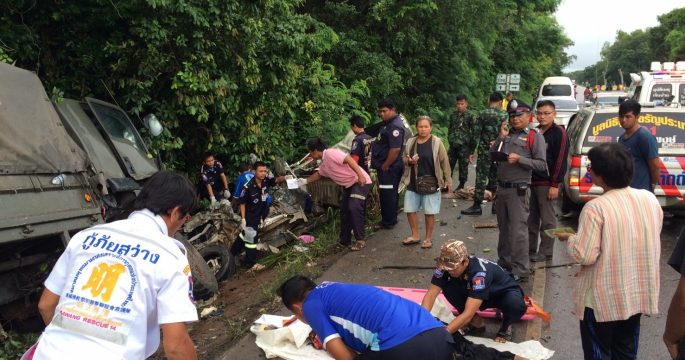 รถกระบะสามีภรรยาเสียหลักดับทั้งคู่ ขณะแซงรถคันหน้าไม่พ้นชนประสานงากับรถทหารกลางถนนวัฒนานคร-สระแก้ว ท่ามกลางสายฝน