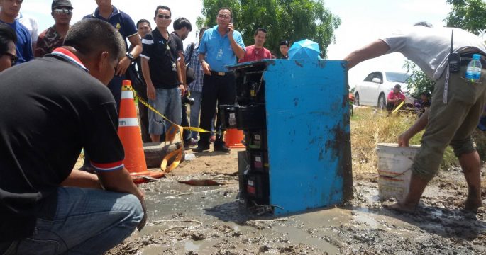 ตำรวจเก็บหลักฐานตามจับแก๊งโจรกรรมตู้เอทีเอ็มจากสุพรรณบุรีเมื่อ 2 วันก่อน โยนทิ้งกลางทุ่งอยุธยา พบร่องรอยงัดและไม่มีเงินในตู้