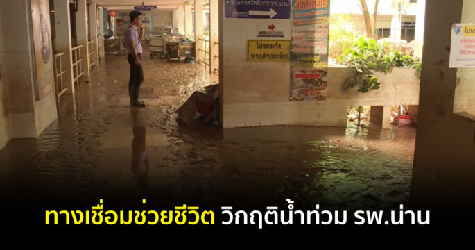 น่าน 26 ก.ค. – น้ำท่วมครั้งประวัติศาสตร์ของเมืองน่านสร้างความเสียหายเป็นวงกว้าง รวมทั้งที่โรงพยาบาลน่าน ซึ่งถูกน้ำท่วมสูงมิดหัว แม้น้ำลดลงแล้ว แต่สร้างความเสียหายอย่างหนัก ช่วงที่เผชิญกับวิกฤติน้ำท่วม สามารถดูและผู้ป่วย 300 ชีวิตให้ปลอดภัยได้ จากทางเชื่อมอาคารที่ยังสร้างไม่เสร็จ กลายเป็นทางเชื่อมช่วยชีวิต.-สำนักข่าวไทย