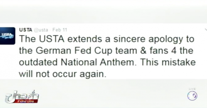สมาคมกีฬาเทนนิสสหรัฐ ออกแถลงการณ์ขอโทษทีมเทนนิสเยอรมนี หลังขับร้องเพลงชาติผิดเวอร์ชั่น ก่อนการแข่งขันเทนนิสเฟด คัพ 2017 ที่เกาะฮาวาย