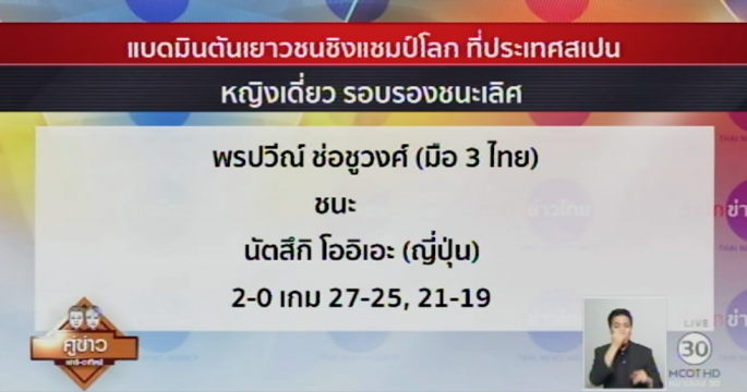 น้องหมิว พรปวีณ์ ช่อชูวงศ์ ผ่านเข้ารอบชิงชนะเลิศหญิงเดี่ยว แบดมินตันเยาวชนชิงแชมป์โลก ที่สเปน โดยเป็นไทยคนที่ 3 ที่ทำได้