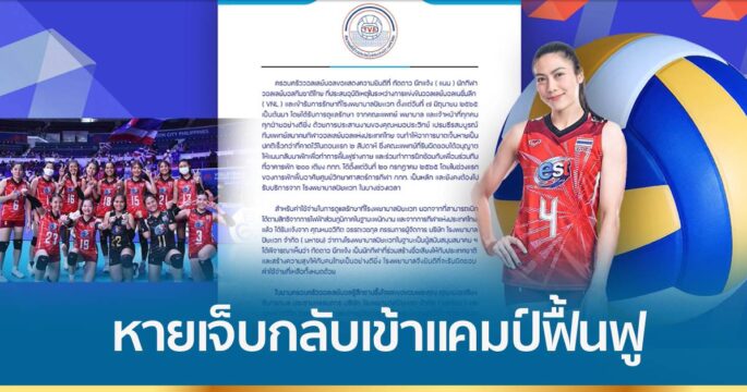 สมาคมวอลเลย์บอลแถลงการณ์ “ทัดดาว นึกแจ้ง” หายเจ็บกลับมาเข้าแคมป์ฟื้นฟูร่างกายร่วมฝึกซ้อมกับเพื่อนร่วมทีม เพื่อเตรียมลุยศึกชิงแชมป์เอเชีย และชิงแชมป์โลก