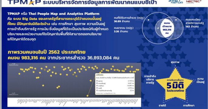 กรุงเทพฯ 6 ต.ค. สมุทรสงคราม โชว์ผล ใช้ระบบบิ๊กดาต้า ค้นหาคนจน วางยุทธศาสตร์แก้ปัญหาแบบบูรณาการ การค้นหาคนจนที่แท้จริง มาตรการของรัฐบาลพลเอกประยุทธ์ จันทร์โอชา นายกรัฐมนตรี ในการช่วยเหลือภาคประชาชนที่มีความยากจน ด้วยการลงทะเบียน เพื่อให้ความข่วยเหลือตามมาตรการ เครื่องมือที่ภาครัฐนำมาแยกแยะเพื่อให้ความช่วยเหลือ ประชาชนที่มีฐานยากจน จริงๆ ได้มีการตั้ง คณะท่างานเฉพาะกิจเพื่อศึกษาแนวทางการพัฒนาระบบ Big Data ของภาครัฐในประเด็น การยกระดับคุณภาพชีวิตของประชาชน ทั้งในด้านการเพิ่มรายได้ ลดภาระค่าครองชีพ และเพิ่มโอกาสด้านอาชีพ สำนักงานคณะกรรมการพัฒนาเศรษฐกิจและสังคมแห่งชาติ (สศช.) และ ศูนย์เทคโนโลยีอิเล็กทรอนิกส์และคอมพิวเตอร์แห่งชาติ (เนคเทค-สวทช.) กระทรวงวิทยาศาสตร์และเทคโนโลยี ได้พัฒนาระบบจัดการข้อมูลการพัฒนาคนแบบชี้เป้า หรือ TPMAP ระบบที่พัฒนาต่อยอดมาจากระบบบริหารจัดการข้อมูลคนจนแบบชี้เป้า (Thai People Map and Analytics Platform)โดยใช้ข้อมูลจำเป็นพื้นฐานของกรมการพัฒนาชุมชน และข้อมูลผู้ลงทะเบียน สวัสดิการแห่งรัฐของกระทรวงการคลัง และใช้วิธีการประมวลข้อมูลเพื่อดูความยากจนในหลายมิติ โดยสศช. ได้น่ามาปรับใช้กับประเทศไทย ให้สามารถครอบคลุมปัญหาที่กว้างขึ้น เช่น เด็กแรกเกิด การศึกษา ผู้สูงอายุ การพัฒนาสภาพที่อยู่อาศัย โดยยังคงความสามารถของระบบเดิมในการชี้เป้าความยากจนไว้ด้วย ระบบ TPMAP สามารถใช้ระบุ ปัญหาความยากจนในระดับบุคคล ครัวเรือน ชุมชน ท้องถิ่น / ท้องที่ จังหวัด ประเทศ หรือปัญหาความยากจน รายประเด็น ซึ่งทำให้การแก้ปัญหาตรงกับกลุ่มเป้าหมายมากขึ้น และสามารถออกแบบนโยบายโครงการ ในการแก้ปัญหา ให้ตรงกับความต้องการหรือสภาพปัญหาได้ สามารถระบุได้ว่าคนจนนั้นอยู่ที่ไหน มีปัญหา ในมิติอะไรบ้าง หลักการท่างานของ TPMAP คืออาศัยข้อมูลจากหลายแหล่งมายืนยันซึ่งกันและกัน ใช้สมมติฐานว่าคนที่ได้รับการส่ารวจว่าคนจน เป้าหมายที่ต้องการความช่วยเหลือเร่งด่วน TPMAP จึงตั้งต้นโดยใช้ข้อมูล ความจำเป็นพื้นฐาน (จปฐ.) จากกรมการพัฒนาชุมชน และข้อมูลผู้ลงทะเบียนสวัสดิการแห่งรัฐ จากกระทรวงการคลัง มายืนยันซึ่งกันและกัน หรืออีกนัยหนึ่ง “คนจนเป้าหมาย” ใน TPMAP คือคนจน ใน จปฐ. ที่ไปลงทะเบียนสวัสดิการแห่งรัฐTPMAP สามารถวิเคราะห์ข้อมูลคนจนจาก หลายแหล่งซึ่ง Data Integration ท่าให้ทราบข้อมูล คนจนที่ใกล้เคียงกับความจริงที่สุด สามารถระบุได้ว่า “คนจนเป้าหมาย” มีปัญหาอะไรบ้างในแต่ละมิติจากข้อมูลจำนวนคนในครัวเรือนยากจน ที่ตกตัวชี้วัดความจำเป็นพื้นฐาน (จปฐ.) ในแต่ละมิ