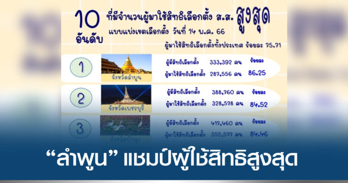 กกต. เผยแพร่สถิติผู้มาใช้สิทธิเลือกตั้ง “ลำพูน” ใช้สิทธิสูงสุดอันดับ 1 เช่นเดียวกับปี 2562 กทม.ไม่ติด 1 ใน 10 ใช้สิทธิสูงสุด