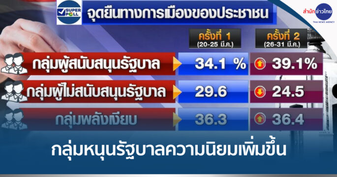 ซูเปอร์โพลเทียบผลโพลเลือกตั้ง 2 ครั้ง พบกลุ่มสนับสนุนรัฐบาลเพิ่มขึ้น ขณะที่กลุ่มผู้ไม่สนับสนุนรัฐบาลลดลง