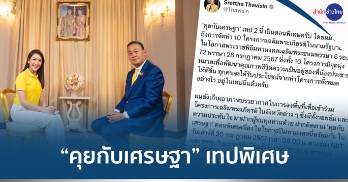 นายกฯ ชวนชมรายการ “คุยกับเศรษฐา” เทปพิเศษ พรุ่งนี้ รวบรวมรอยยิ้ม-ความประทับใจ จากการลงพื้นที่ร่วมโครงการเฉลิมพระเกียรติ ชี้ 10 โครงการมุ่งพัฒนาคุณภาพชีวิตประชาชนให้ดีขึ้น