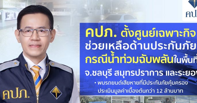 คปภ. ตั้งศูนย์เฉพาะกิจช่วยเหลือด้านประกันภัย กรณีน้ำท่วมฉับพลันในพื้นที่จังหวัดชลบุรี สมุทรปราการ และระยอง พบรถยนต์เสียหายที่มีประกันภัยคุ้มครอง ประเมินมูลค่าเบื้องต้นกว่า 12 ล้านบาท