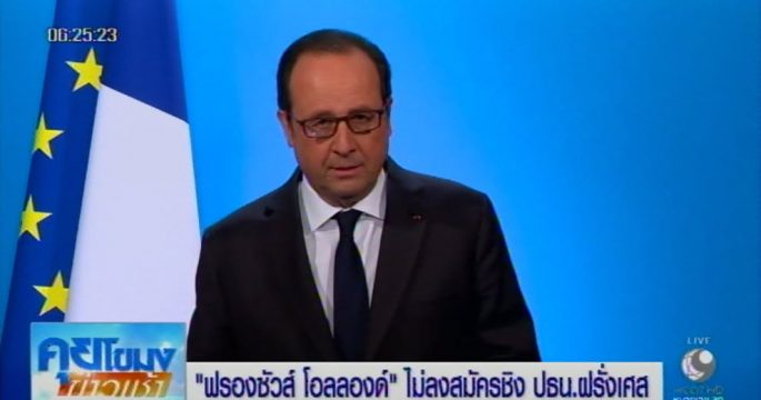 ประธานาธิบดีฟรองซัวส์ โอลลองด์ ประกาศไม่ขอลงสมัครชิงตำแหน่งประธานาธิบดีอีกสมัย หลังคะแนนนิยมดำดิ่ง กลายเป็นผู้นำฝรั่งเศสคนแรกในประวัติศาสตร์ที่ไม่ลงชิงชัยตำแหน่งเป็นสมัยที่สอง