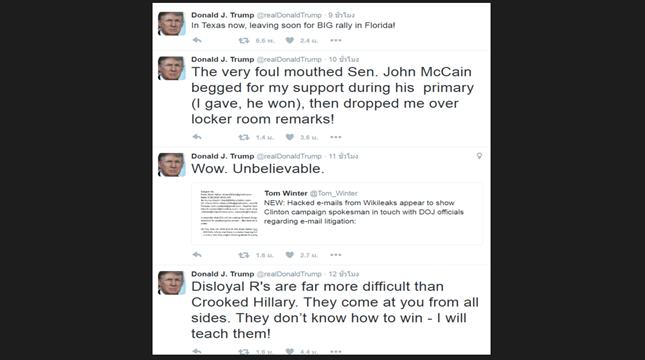 นายโดนัลด์ ทรัมป์ ผู้ชนะการเลือกตั้งประธานาธิบดีสหรัฐชื่นชมการสื่อสารผ่านช่องทางสังคมออนไลน์ เช่น ทวิตเตอร์ ที่ช่วยให้เขาชนะเลือกตั้งสหรัฐ
