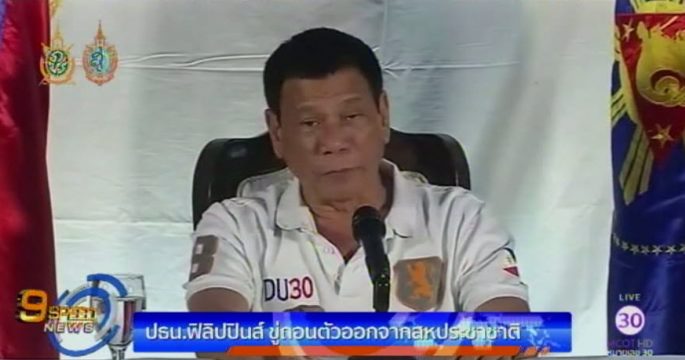 ประธานาธิบดีโรดริโก ดูเตอร์เต ประกาศขู่จะถอนตัวออกจากองค์การสหประชาชาติ หลังจากถูกท้วงติงให้ระงับแผนการปราบปรามยาเสพติด ด้วยการสังหารนักค้ายา