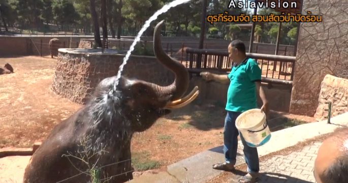 ใครไปเที่ยวตุรกี ช่วงนี้ควรระวังคลื่นความร้อนที่แผ่ปกคลุมหลายพื้นที่ อากาศที่ร้อนจัดทำให้สัตว์ในสวนสัตว์หาวิธีบำบัดความร้อนแตกต่างกันไป สัตว์ใหญ่อย่างช้างโชคดี เจ้าหน้าที่ช่วยหาวิธีคลายร้อนให้