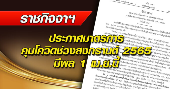 9 ข่าวค่ำ ช่วงที่ 5 วันพฤหัสบดีที่ 31 มีนาคม 2565• ราชกิจจาฯ ประกาศมาตรการคุมโควิดช่วงสงกรานต์ มีผล 1 เม.ย.