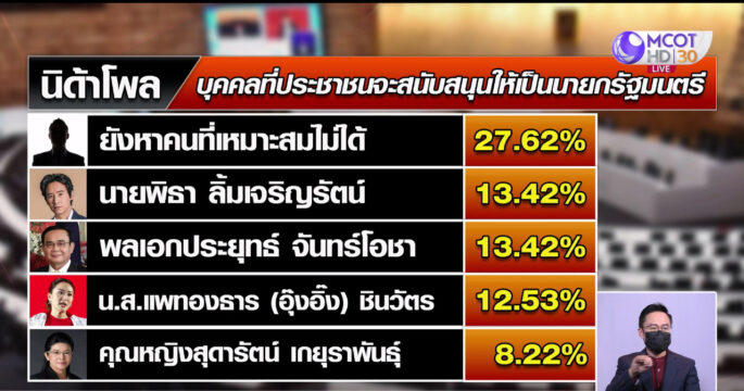 คู่ข่าวเสาร์-อาทิตย์ (ช่วงที่ 4) วันอาทิตย์ที่ 27 มีนาคม 2565• ไม่แผ่ว ติดโควิดเพิ่ม 25,821 คน เสียชีวิต 84 คน• นิด้าโพล เผยบุคคลที่ประชาชนสนับสนุนให้เป็นนายกฯ 27.62% ยังหาคนที่เหมาะไม่ได้
