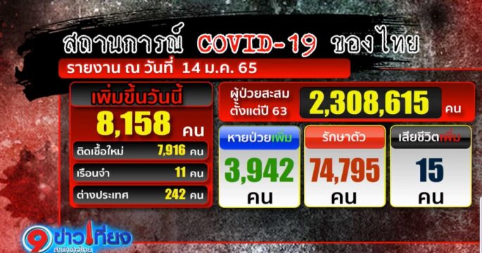 9 ข่าวเที่ยง (ช่วงที่ 2) วันที่ 14 มกราคม 2565• โควิดติดเชื้อใหม่ 8,158 ราย เสียชีวิต 15 ราย• โฆษก สธ.เผย 6 ข้อมูลความรุนแรงโอมิครอนในไทย• สหรัฐส่งทหารช่วย รพ. สู้โอไมครอน• อินเดียจัดงานอาบน้ำศักดิ์สิทธิ์ ไม่สนโควิด