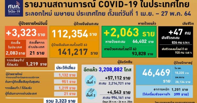 ข่าวเที่ยง (ช่วงที่ 2) วันพฤหัสบดีที่ 27 พฤษภาคม 2564 ติดเชื้อเพิ่ม 3,323 ราย เสียชีวิตพุ่ง 47 ราย ราชวิทยาลัยจุฬาภรณ์เตรียมแถลงนำเข้าวัคซีนโควิดพรุ่งนี้ ส.ส.อภิปรายหนุน พ.ร.ก.เกี่ยวกับประมวลกฎหมายแพ่งและพาณิชย์