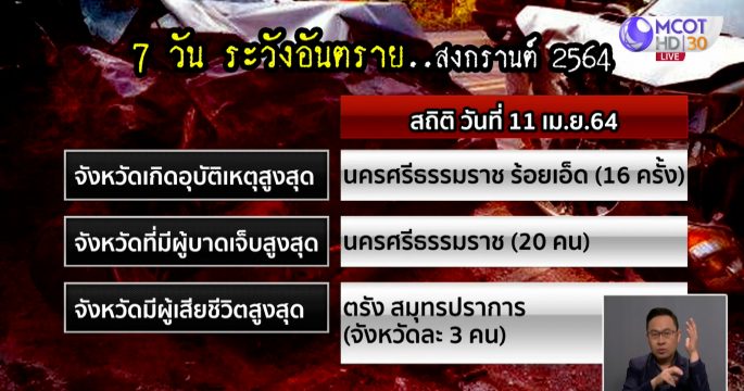 ข่าวเที่ยง ช่วงที่ 2 วันจันทร์ที่ 12 เมษายน 2564 • รถขบวนแห่สงกรานต์จอดสนิท• พิษโควิดท่องเที่ยวเข้ากระโดงเงียบเหงา• ดาราติดโควิด-19 เพียบ• ผู้ว่าการ ททท. ตรวจแล้วไม่พบเชื้อโควิด-19• แม่ค้าสลากฯ โดนลูกค้า ใช้แบงก์ปลอมจ่าย• 7 วันระวังอันตราย