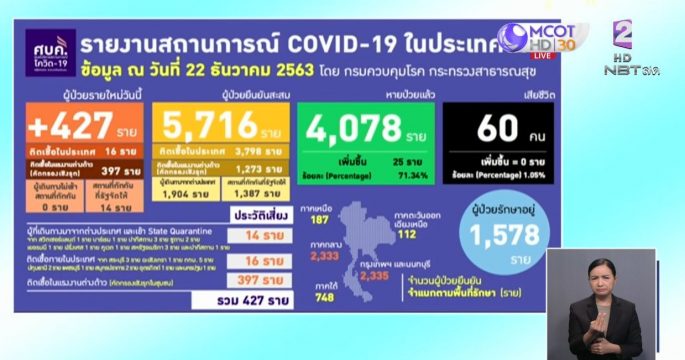 ข่าวเที่ยง (ช่วงที่ 1) วันอังคารที่ 22 ธันวาคม 2563• พบป่วยโควิดเพิ่มอีก 427 ราย ส่วนใหญ่เป็นต่างด้าว• เปิดไทม์ไลน์เจ้าของร้าน “สมศักดิ์ปูอบ” สาขา 2 ติดโควิด• เร่งตรวจหาเชื้อแรงงาน จ.สมุทรสาคร• ย้าย สสจ.สมุทรสาคร เพื่อเอาคนชำนาญออกรบ• สั่งเพิ่มกำลังทหารตรวจเข้มชายแดน ป้องกันลักลอบเข้าประเทศ