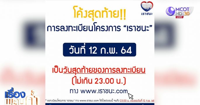เรื่องพลบค่ำ (ช่วงที่ 4) วันศุกร์ที่ 12 กุมภาพันธ์ 2564• วันสุดท้ายลงทะเบียนไทยชนะ แอปฯ เป๋าตังล่ม• กินไก่ไหว้ตรุษจีน อาหารเป็นพิษ หามส่ง รพ.นับสิบราย• สลด! ช้างล้ม เพราะอดอยาก