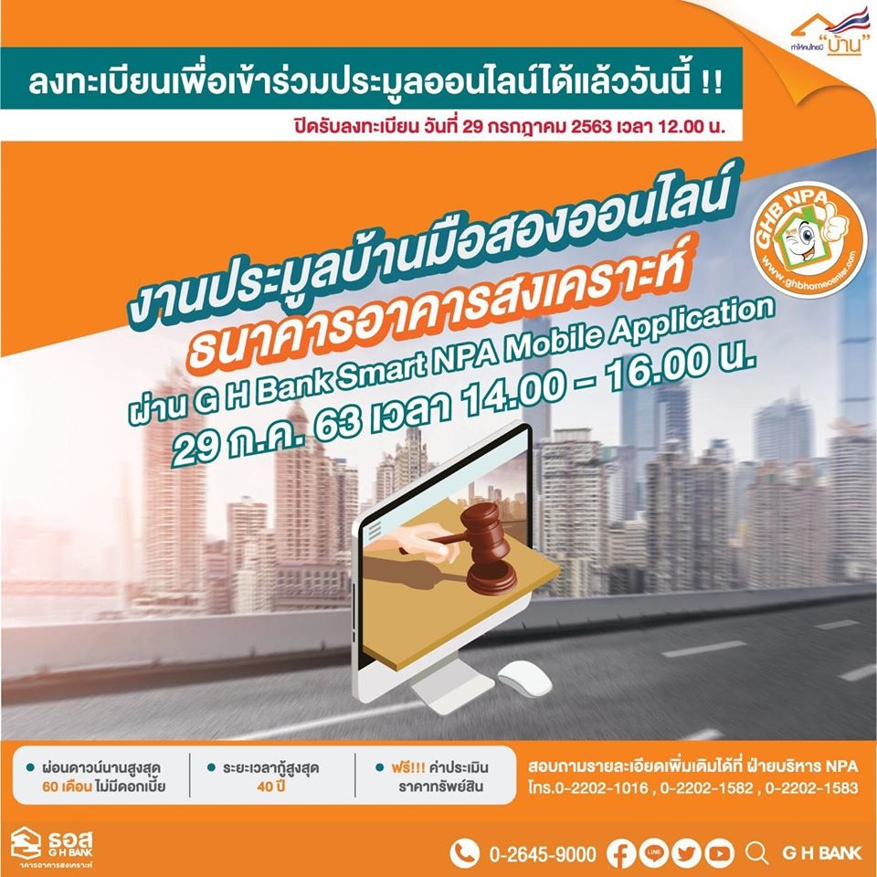 ธนาคารอาคารสงเคราะห์ (ธอส.) จัดประมูลบ้านมือสองออนไลน์ครั้งแรก ผ่าน Application: G H Bank Smart NPA วันที่ 29 กรกฎาคม 2563 เวลา 14.00 – 16.00 น. โดยลูกค้าสามารถลงทะเบียนเข้าร่วมประมูลออนไลน์ได้ตั้งแต่วันนี้ถึงวันที่ 29 กรกฎาคม เวลา 12.00 น. พบกับทรัพย์เด่นทำเลดี ส่วนลดสูงสุดถึง 20% ผ่อนดาวน์นานสูงสุด 60 เดือน ไม่มีดอกเบี้ย ระยะเวลากู้สูงสุด 40 ปี ฟรีค่าประเมินราคาทรัพย์สิน ดูรายการทรัพย์ประมูลออนไลน์ได้ที่ https://www.ghbhomecenter.com/promotion-225 ลูกค้าที่สนใจสามารถดาวน์โหลดและอัพเดทเวอร์ชั่นล่าสุดของ Application : G H Bank Smart NPA แอปบ้านมือสองของคนออนไลน์ ดูง่ายจองสบายในแอปเดียวทั้งระบบ Android และ IOS ทำได้ทั้งค้นหาทรัพย์ที่ต้องการ คำนวณรายละเอียดค่าใช้จ่ายที่เกี่ยวข้องกับการซื้อทรัพย์ ยื่นคำร้องขอเข้าดูทรัพย์ในสถานที่จริง และจองทรัพย์ผ่านแอปพลิเคชั่นได้ สอบถามรายละเอียดเพิ่มเติมได้ที่ศูนย์ลูกค้าสัมพันธ์ (Call Center) โทร 0-2645-9000 และ Facebook Fanpage ธนาคารอาคารสงเคราะห์.-สำนักข่าวไทย