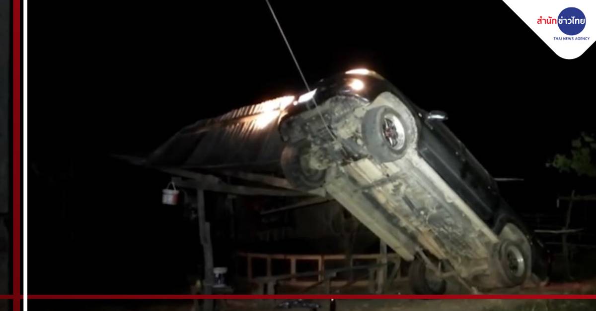 • หนุ่มซิ่งกระบะปีนลวดสลิงลอยไปติดเสาไฟฟ้า