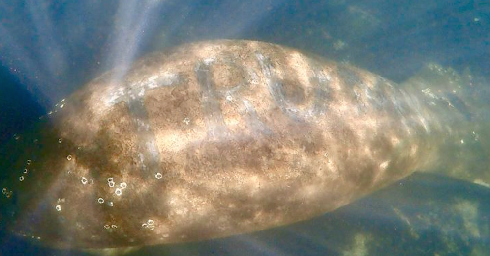 • มือบอน สลักชื่อ “ทรัมป์” กลางหลังพะยูน