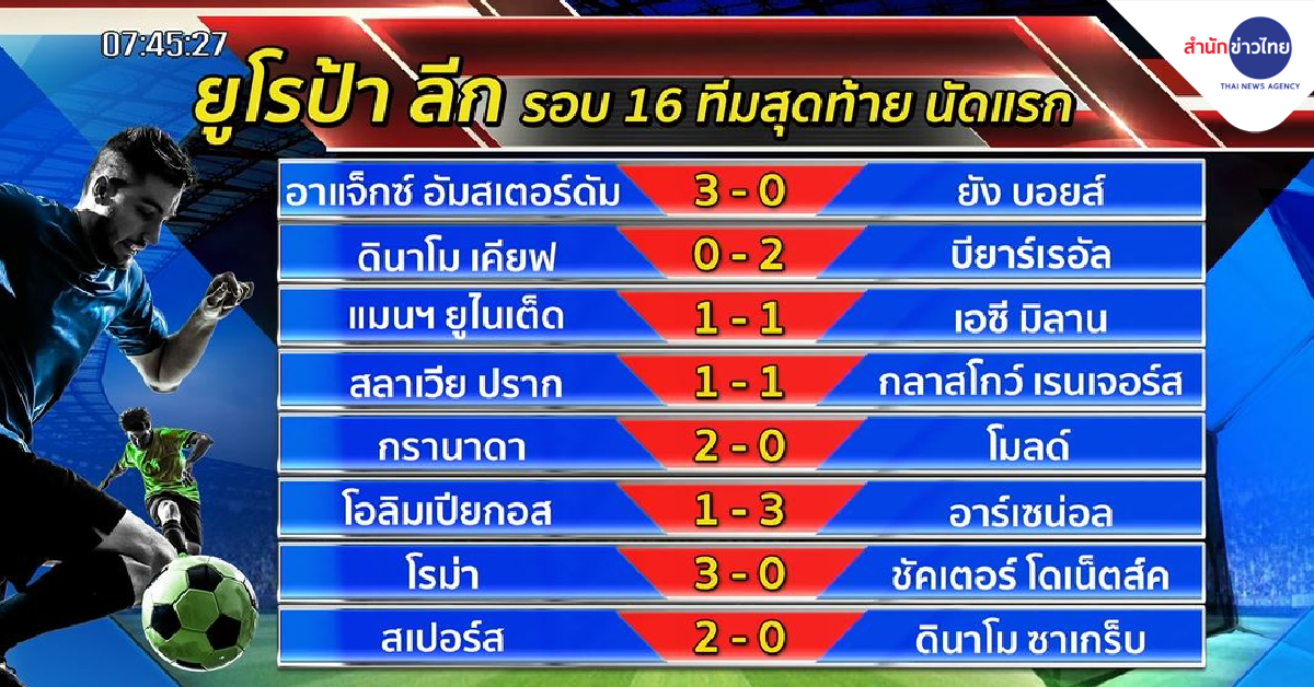 ► ผลฟุตบอลยูโรปา ลีก รอบ 16 ทีม นัดแรก