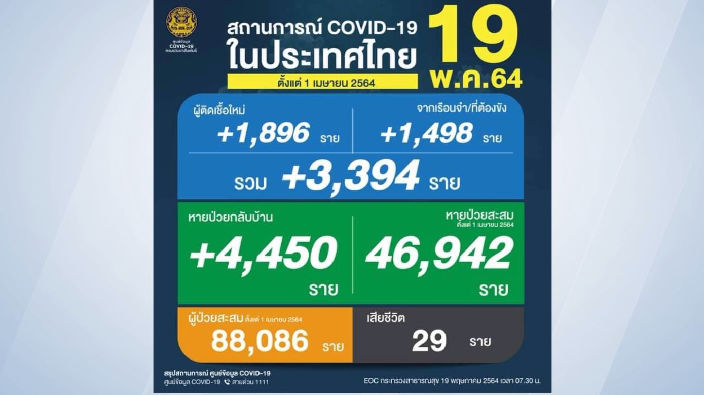 - ยอดโควิด-19 วันนี้ติดเชื้อพุ่งอีก 3,394 คน เสียชีวิต 29 คน