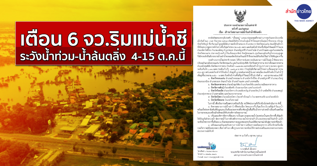 • เตือน 6 จังหวัดอีสาน ระวังน้ำชีล้นตลิ่ง 4-15 ต.ค.นี้