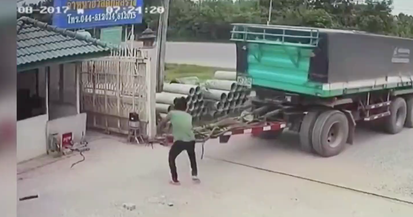 – หนุ่มโชว์พลังดึงส่วนพ่วงรถสิบล้อ ไม่ให้ไหลลงถนน